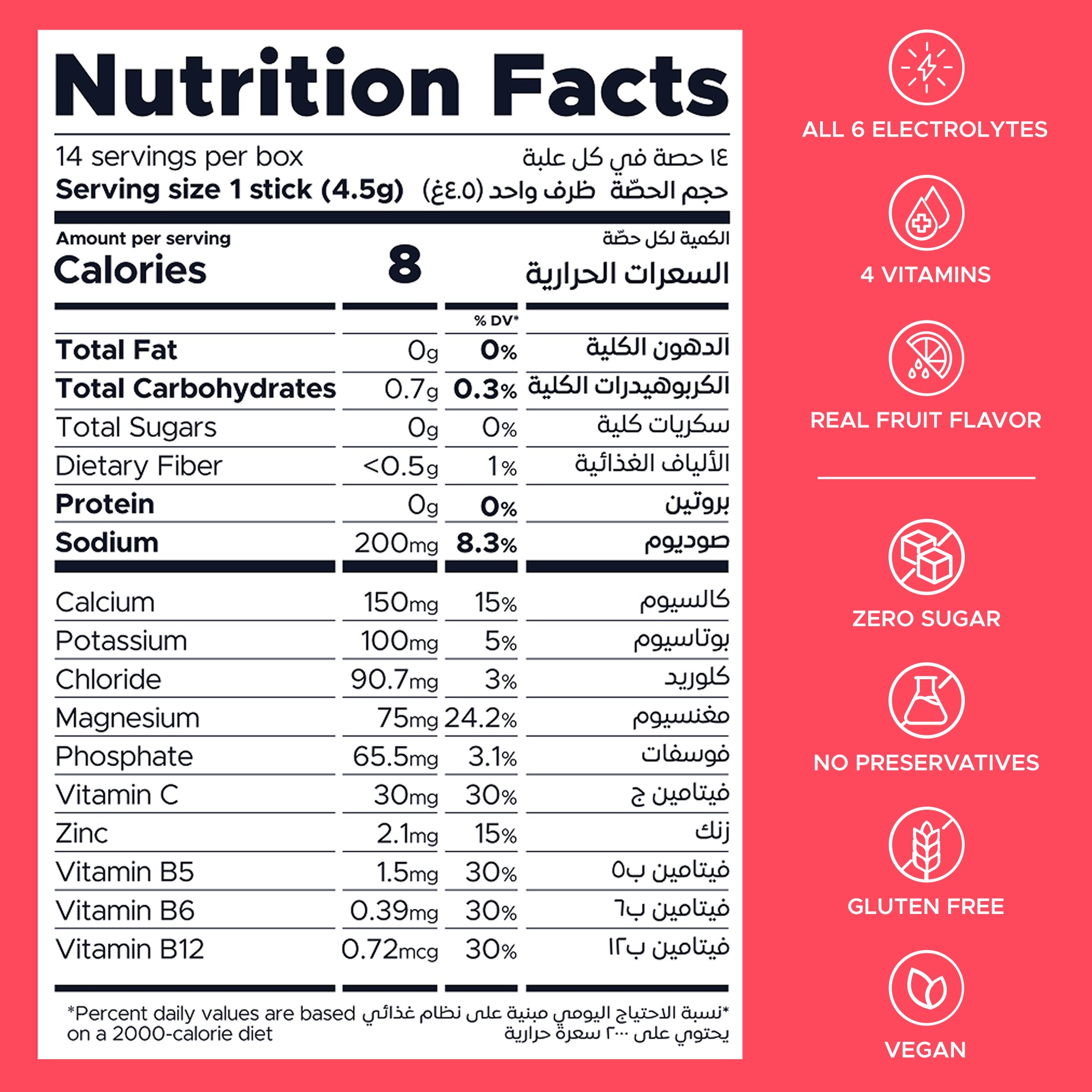 Each stick contains six essential electrolytes—sodium, potassium, magnesium, calcium, chloride, and phosphate—along with vitamins B5, B6, B12, and C, and zinc. This blend supports hydration, energy, focus, and recovery, all without sugar or artificial additives.