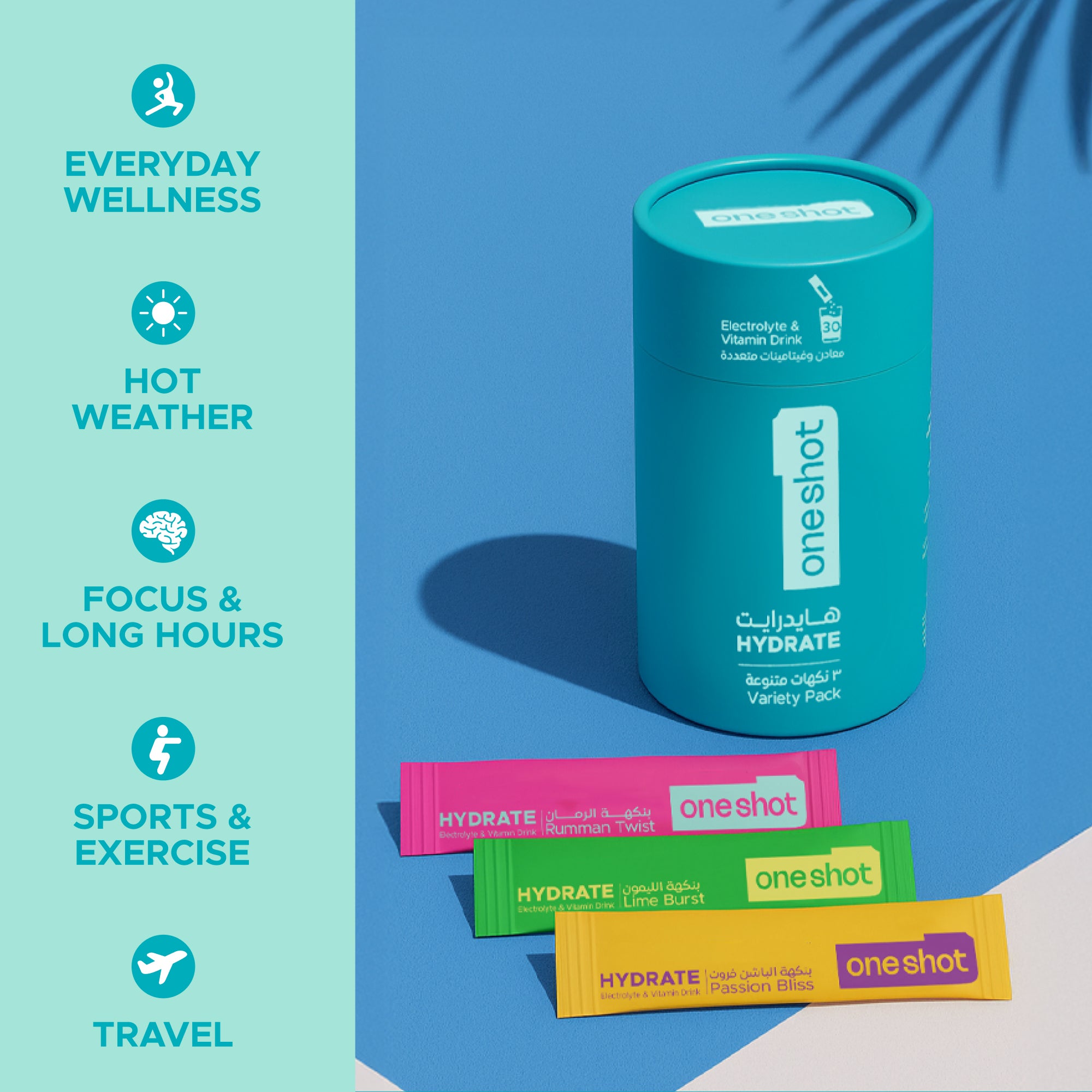 oneshot is perfect anytime you need hydration or a boost, such as during or after workouts, while fasting, traveling, or recovering from dehydration. It’s also great for staying energized on busy days.