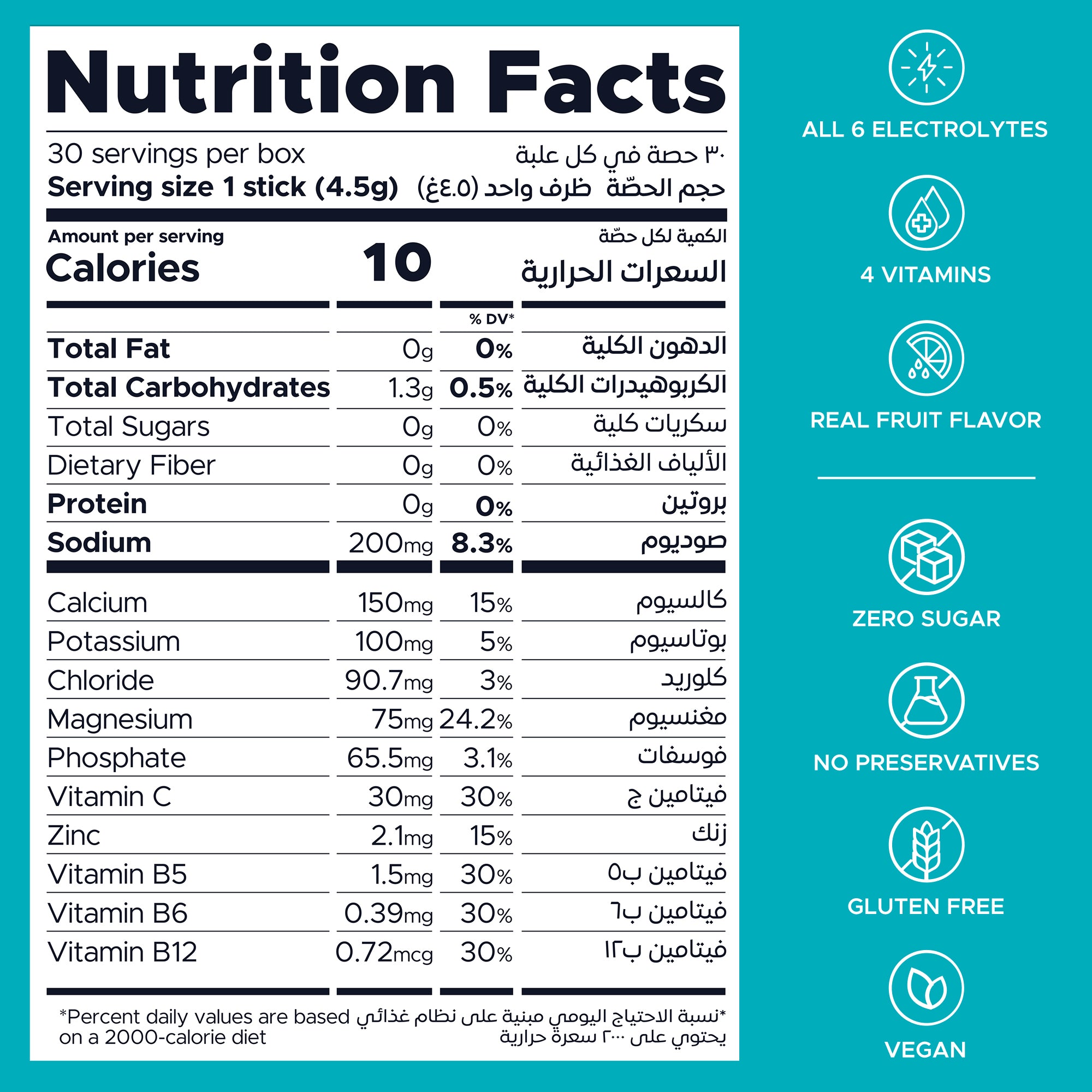 ✅ All 6 electrolytes + 4 vitamins + zinc.