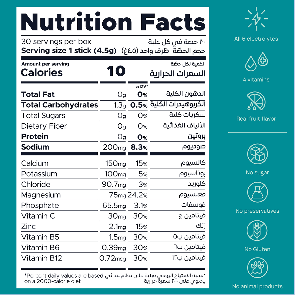 Each stick contains six essential electrolytes—sodium, potassium, magnesium, calcium, chloride, and phosphate—along with vitamins B5, B6, B12, and C, and zinc. This blend supports hydration, energy, focus, and recovery, all without sugar or artificial additives.